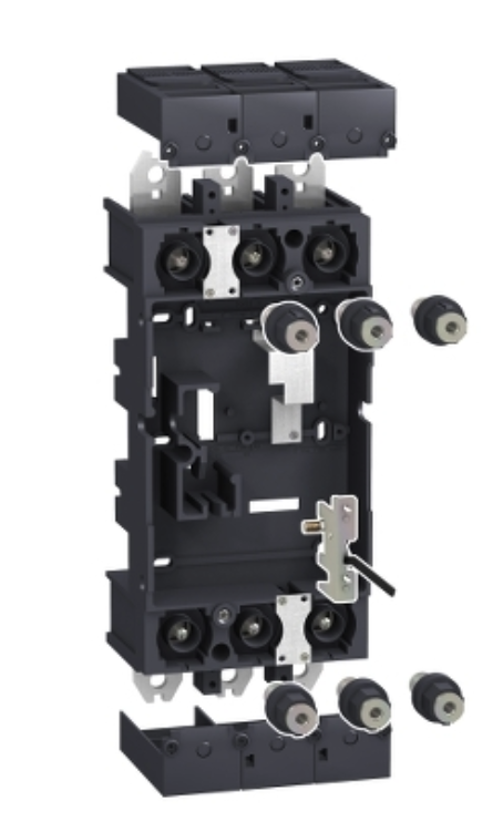 This plug-in kit is designed for 3-pole ComPact NSX400 and NSX630 fixed circuit breakers. By integrating this kit, a fixed circuit breaker can be converted into a plug-in configuration, facilitating swift and straightforward installation or removal from its base without the need to connect or disconnect the power circuit.