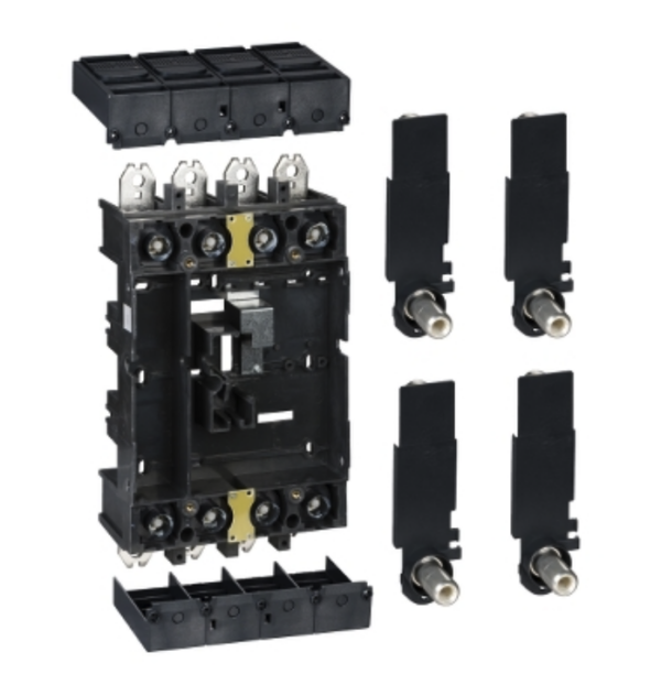 This plug-in kit is designed for 4-pole ComPact NSX400 and NSX630 fixed circuit breakers. By integrating this kit, a fixed circuit breaker can be converted into a plug-in configuration, facilitating swift and straightforward installation or removal from its base without the need to connect or disconnect the power circuit.